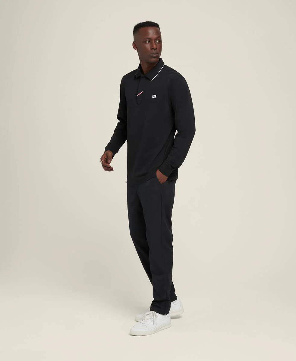 洗練さと機能性を兼ね備え、ワークパンツに使われる、ハリと光沢のあるテクニカルツイル生地でデザインされたロングパンツ。なめらかな手触りはもちろん、色落ちしにくく、さらにシワになりにくい、速乾・通気性・伸縮性が特徴の1枚。ウエスト部にはドットボタンを採用。十分な収納能力のあるマルチポケット搭載でゴルフシーンでも活躍。
