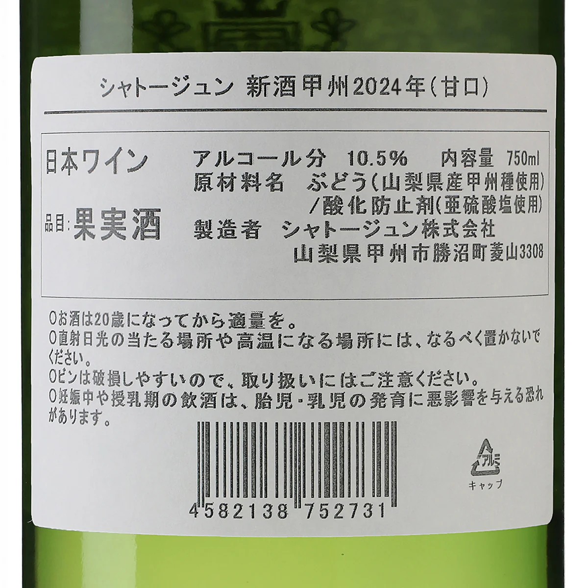 wa-syuを運営する「ジュングループ」直営のワイナリー「シャトージュン」より、毎年11月3日に解禁日とされている「山梨ヌーボー」の白ワインが到着!「山梨ヌーボー」とは、山梨県内でその年に収穫された日本固有品種「甲州」と「マスカット・ベーリーA」を使って醸造された新酒ワインのこと。できたてのフレッシュな味わいをいち早く堪能できるのは、日本ワインならでは!「甲州」品種で醸造した、フルーティーな甘口の2024年新酒を肩肘張らずにカジュアルにお楽しみください。